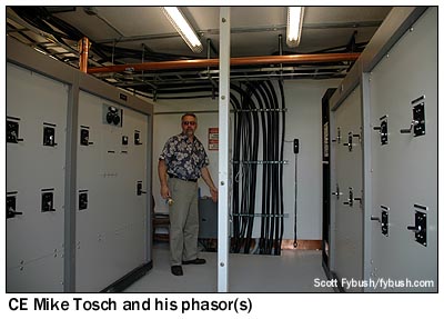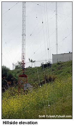 From the transmitter, we head up to the top of the hill to see the towers - well, five of them, anyway. The sixth tower had to be placed a little ways down the side of the hill, and that meant its base had to be elevated to match the height of the other five. And that meant that it, alone of the new towers, exceeded 200 feet in height and had to be painted and lit, never mind that it doesn't poke up any higher above the terrain than the five 199-footers on the hilltop. There are three small buildings on the hilltop - one for the two-way users who populate a little communications tower up here, one that housed the old three-tower phasor, and a new one that houses the day and night phasors for the new towers. From here, it's back down the hill for a quick lunch - and then up another, much taller, hill for a date with some even more unusual LA tower history. We'll get there next week!