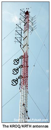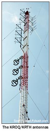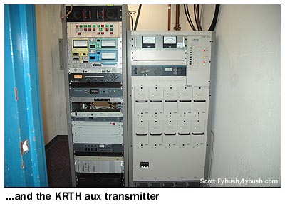 When KROQ (under CBS) came under common ownership with KRTH (101.1 Los Angeles), the site became home to an auxiliary transmitter for "K-Earth." Today, the KRTH auxiliary antenna sits just below KROQ's own antenna on a guyed tower just north of the old line of four AM towers. (That's a KROQ auxiliary antenna below the KRTH aux and the KROQ main.)