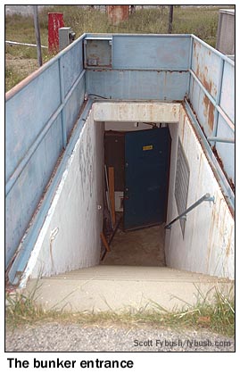 That, however, is merely a temporary solution, and during our April visit to the site there was major construction work underway that will dramatically change the face of Verdugo Peak. The building shown in the foreground of the KXOL picture above will eventually house KXOL itself, along with auxiliary transmitters for the rest of CBS Radio's Los Angeles FM stations - KCBS-FM (93.1), KTWV (94.7) and KLSX (97.1) - thus providing an alternative site if those stations experience trouble with their main transmitters on Mount Wilson. (KRTH's aux will remain as well, but its transmitter, and KROQ's, will stay underground.) A massive (seven-foot face) new tower has now been erected on the pad seen at the left side of the photo to provide space for all those antennas, and the building's completed now, too. Remarkably, this building is the first above-ground structure at this site. When KBLA came up here in 1964, it put its transmitter in an underground bunker, and in good Cold War fashion the bunker was equipped with a rolling concrete blast shield that could be moved into place above the stairwell, though it's not clear what good it would have done if the power lines and towers above ground had been wiped out. (Veteran LA engineer Burt Weiner says he visited the site when it had just been completed, and he was told then that the idea behind the underground transmitter room was to provide RF shielding for KBLA's audio equipment.) Look very closely at the stairwell photo above; those are rails on either side of the stairwell, and there's a flip-up metal door at the rear that allows the concrete slab to be moved into place. The last time anyone tried to do it, as a joke a few years ago, they discovered a fire-ant nest under the concrete - and we've heard that there are rattlesnakes down there, too.