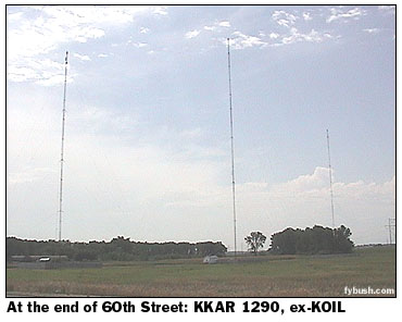 First up, a single stick at 36th and Gold, home to KOSR (1490), the Fox Sports affiliate, then down S. 60th Street to its end at Harrison, where we find an attractive three-tower array. Today, the AM 1290 facility is known as KKAR, but that's a recent call change. For decades, this was KOIL, the station that took on the top-40 mantle in town when KOWH faded (with a brief hiccup in the late-seventies when billing and contest irregularities caused KOIL's then-owners to lose all their licenses!) The KKAR calls and talk format originated with the Bellevue 1180 when it signed on in the early nineties; later on, KKAR moved to 1290 and the KOIL calls went to 1180 as Radio Disney. This site is also home to KAZP on 1620, the X-band ESPN Radio outlet that began as an offspring of 1180. 2006 update: KAZP became KOZN, "1620 the Zone," but it's still doing sports. KKAR recently received a construction permit to increase its day power to 50 kW from this site, replacing an identical earlier CP that was never built out.