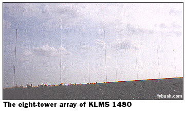 2006 update: This was the tower that ended up keeping KETV on the air after its main stick on 72nd Street collapsed. It, in turn, sits just a block or so away from still another self-supporter, the former home of KMTV (Channel 3). The CBS affiliate moved its studios out of downtown around the same time it moved its transmitter up to 72nd Street; it's now near the Journal cluster out west of town, at 108th and Mockingbird. We make a quick dash across the Missouri River under rainy skies to take in three AM sites on the Iowa side: KOIL (1180) transmits Radio Disney from three towers on Sunnydale Road, northeast of Council Bluffs, while the two towers of Spanish KBBX (1420) sit just south of the one tower of gospel KLNG (1560) just off US 275, just east of the bridge to Omaha. (KOIL is licensed to Bellevue, NE, south of Omaha, while KLNG is licensed to Council Bluffs and KBBX to Omaha.) 2006 update: That 1180 facility, by then KYDZ, went dark in early 2006, having surrendered its license in favor of X-band sister KOZN on 1620. Waitt was one of several licensees petitioning the FCC for permission to put its standard-band stations back on the air, and 1180 returned in June with Spanish-language adult hits. KBBX moved its Spanish broadcasts to Journal's 97.7, and 1420 ended up joining KCRO (660) and KGBI (100.7) under Salem Broadcasting's umbrella. It's now talker KOTK.