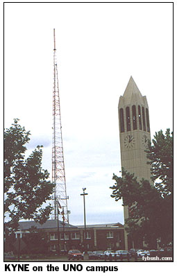 Dodge Street itself is home to plenty more radio and TV; at 70th Street is the studio of stand-alone KEFM (96.1), and we can remember when the 1420/104.5 combination, then known as KESY, was just a block away. (Today those stations, KBBX and KSRZ respectively, are part of the Journal Broadcast Group and housed in the cluster's main facility on John Galt Boulevard far out on the western edge of town, with KEZO, KKCD, KQCH (97.7) and KOSR (1490)). 2006 update: KEFM eventually ceased to be a stand-alone, becoming part of Clear Channel. It's now KQBW, "The Brew," and is in with KFAB at 5010 Underwood. And Journal has moved KEZO and the others out of John Galt Boulevard and up to 72nd Street. A few blocks east of KEFM is the University of Nebraska-Omaha campus, crowned by a self-supporter that's home to KYNE (Channel 26), the local outlet of Nebraska ETV. A block south of Dodge, at 46th and Farnam, is the Pappas Telecasting facility that's home to KPTM and KXVO (KPTM was alone here when we visited in 1993). Eleven blocks east, another self-supporting tower announces the home of Omaha's NBC affiliate.