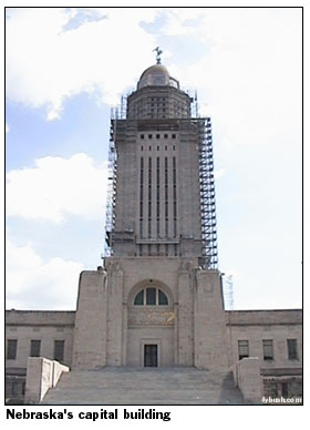 Saturday, June 30 - We still manage to get some travel in, with a side trip to Lincoln, the state capital some 70 miles to the west. Nebraska's state capital is interesting for two reasons: first, it's an imposing Art Deco-style tower built at the height of that architectural movement in the thirties; second, because Nebraska is the only state in the union with a unicameral legislature. This building does have a Senate chamber, but it's now used purely for ceremonial functions. Heading out of downtown, we're bound for the corner of 40th and "W" Streets, where the studios of KOLN-TV (Channel 10), the CBS affiliate, sit across from a tower that's home to KLIN (1400), KFOR (1240), KKUL (105.3) and KFRX (102.7). A studio building a few blocks away, at 43rd and O, is home to a large cluster of Lincoln radio stations, identified by a rotating sign outside. (From the looks of the building, we suspect it might once have been a funeral parlor, reminiscent of the Cumulus cluster we'd seen earlier in the week in Davenport, Iowa...)