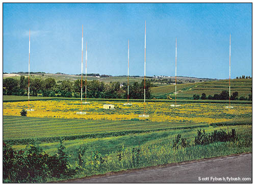 Southeast of the town of Papillion, some 20 miles south of Omaha in Sarpy County, we come to Capehart Road and S. 60th: the four towers of KFAB itself. It's a nice looking site, especially with that one self-supporter amidst the guyed, top-hatted sticks. It turns out that, had we seen an engineer around, we could have seen a new transmitter being installed inside this old building. (A fellow DXer picked the right time to drive by later in the summer and was treated to the grand tour...) 2006 update: Did we say "four" towers? Well, yes, there are four towers here - but as several Nebraska radio folks pointed out as soon as the 2002 calendar appeared with KFAB in it, there are only three towers in KFAB's directional array. What gives? The tower on the right is a cunning decoy, built several decades ago for what was then KFAB-FM on 99.9. It's completely detuned on 1110, and these days I don't think it's even used as an auxiliary for the FM, which is now KGOR and which moved to the 72nd Street tower farm years ago. Want to see more Omaha? So do we - and you'll be pleased to know that a series of family committments mean that we'll be returning to eastern Nebraska on more or less an annual basis for a few years, beginning in the spring of 2007. Stay tuned! The Tower Site Calendar 2007 is here! Be one of the first to receive your copy - order today at the Fybush.com Store!