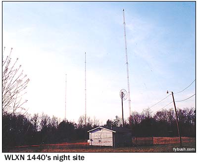 Past Statesville, the landscape changes dramatically. Mountains give way to flat countryside, and the rural character of western North Carolina yields to a fast-growing suburbia known locally as "the Triad." The name comes from the three cities at the region's heart - Winston-Salem, Greensboro and High Point - but now applies to a wide swath of west central North Carolina that extends south to Asheboro and north almost to the Virginia border. Lexington, at the south end of the Triad, has one feature that appeals to tower buffs: a two-site AM operation. WLXN (1440) does sports, running 5000 watts non-directional by day from a tower next to its studios along business I-85 and 1000 watts directional at night (aimed largely to the east) from these three towers near a farmer's market west of town. (Lexington also has an FM outlet on 94.1, WTHZ, that's in the process of being sold and moved south to the Charlotte market.)