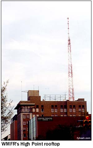 There must not be a lot of activity in High Point - at least, that's the only explanation we can think of for why our tower-hunting activity suddenly attracted the attention of the local constabulary. Granted, it was just a few days after the start of the war - but do you see anything that looks sensitive in the photo to the left? That's WHPE (95.5), the Triad outlet for the Bible Broadcasting Network and a very old FM facility, tracing its history all the way back to the forties and the High Point Enterprise newspaper, which put WHPE on the air as one of the region's first FM facilities. WHPE went religious in the sixties and hasn't changed much since; like so many Bible Broadcasting Network facilities, it's run primarily from network headquarters down in Charlotte, with the local studio staffed only a few hours a week.