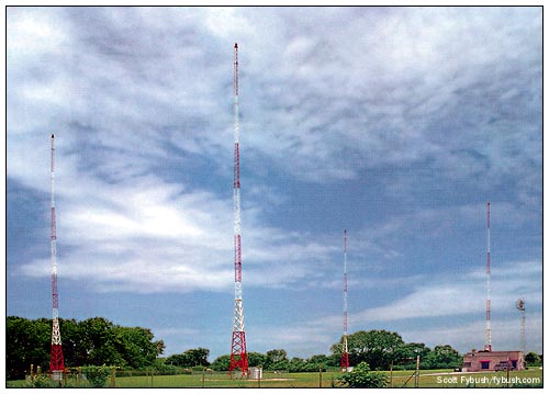 We'll close with one more Chicago picture from our archives, also from one of our 2003-2004 trips to the Windy City. This one is the newest AM station licensed to Chicago, signing on in 1989 from this nine-tower site at 103rd St. and Woodlawn Avenue on the far South Side, just off I-94. When it signed on at 1200 kHz (with 10 kW days from the middle tower and three of the in-line towers, and 1 kW nights from all eight of the in-line towers), it used the calls WOPA, which had a long history on 1490 and 102.7 in Oak Park, now WPNA and WVAZ, respectively. In 1995, it became WLXX, and when we got there in 2003 it had just gone through two calls in quick succession, first WVIV ("Viva," now on 103.1 Highland Park) and then WRTO, which is the current set of calls to go with the "La Tremenda" talk format that migrated there from WIND (560) a few years back. WRTO has a construction permit to move to a new six-tower site on 127th Street in the Blue Island area, from which it will run 20 kW days/4.5 kW nights, so this site may pass into Chicago radio history soon enough. Next week, a bumpy, rocky ride up to one of the nation's most remote big-city transmitter sites...