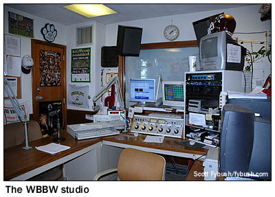 Crossing the parking lot into the main building (which fronts on Simon Road, but with its entrance on the back side, facing the parking lot and the old garage building), we head first into the lobby, where Jerry regales us with some reminiscing over the big displays of WHOT history. WHOT's a rare beast - one of only a handful of stations that have successfully stuck with top 40 through the transition from AM to FM (another was WJET in Erie, also owned by Myron Jones, which has since changed FM format and calls) - and it's proud of its nearly half a century playing the hits. Down the hall to the right of the lobby, we find the WBBW studio, where there's a daily local sports talk show amidst the ESPN Radio satellite programming, and next to that the WYFM studio.