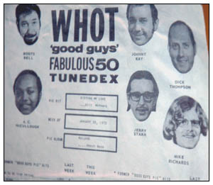There's a little Nautel 1000-watt transmitter on the floor of the WHOT-FM transmitter building that's keeping WBBW on the air, and the signal sounds pretty good, all things considered. (By December, WBBW was back to Knox Street, using the new antenna strung on the new WNCD 93.3 tower there.) With the transmitters properly visited, we begin our studio tour in the former garage building at the back of the "Radio Center" property. It's been extensively renovated, and now houses the engineering office for the cluster and the studios and traffic departments for WQXK, WSOM and WWIZ. WQXK - aka "K105" - is the big gun here, with a class B FM signal that serves not only Youngstown but also Canton and even parts of the Akron market with country music. WSOM does standards, with former WHOT personalities Johnny Kay and Dick Thompson on the air - and a few classic WHOT "Tunedex" surveys taped to the studio window. That's Johnny and Dick in the upper right corner of that 1973 survey, and Jerry Starr right below them. (Love the glasses!)