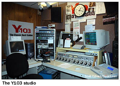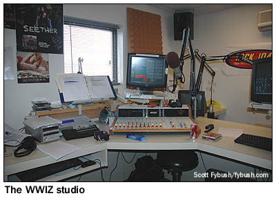 WWIZ - aka "Rock 104" - has its own little studio at the front of the back building. (Why are all these rooms empty? Our visit coincided with the big Canfield Fair, at which all the Youngstown stations do daylong remotes. The Cumulus stations all had their air personalities out at the fair, and through the miracle of computer automation, there's not even any need for a board operator back at the station - the jocks can run everything right from the fair!)