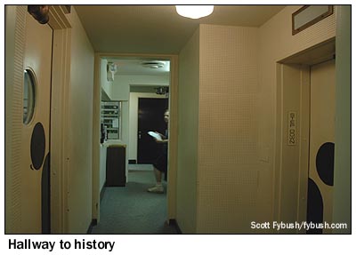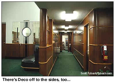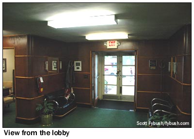 It took another visit to Canton, on the way to the National Radio Club's convention in Akron this past September, to finally get me inside that main entrance. And when I finally did, my jaw dropped right down into the green carpeting. Curvy wooden paneling? Check. Big glass window into the studio? Check. Fancy lighting? Yup. Heavy studio doors with round windows? Oh yeah. Short of 30 Rock and what's left of Columbia Square in Hollywood, this may well be the best-preserved bit of "Radio Deco" in existence, right down to the mirrored lights next to the fancy paneled doors (with - yes! - round windows) that lead to the bathrooms on either side of the lobby.