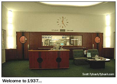 In 1939, WHBC was sold to the Ohio Broadcasting Company, which was owned by the Vodrey and Boyd families. The Vodrey family, under the reorganized name of "Beaverkettle Company," owned the station until 2000, when it was sold to present owner NextMedia. WHBC grew quickly in the forties, moving to 1230 in 1941 with the NARBA shuffle, then to 1480 on June 4, 1944, taking the frequency vacated by WGAR in Cleveland when it moved to 1220. The move took WHBC to 5 kilowatts fulltime - and indeed, it would remain the only fulltime AM station in Canton for many decades. WHBC-FM came along on 94.1 in 1948 (some sources say 1947), and today, as "Mix 94.1," it occupies what I think was "Studio B," to the right of the AM air studio. The old viewing gallery for that studio is now a production room. On the other side of the AM air studio is the former Studio A, which is now the WHBC newsroom. Its former viewing gallery, now walled-off, is the general manager's office, right off the lobby.