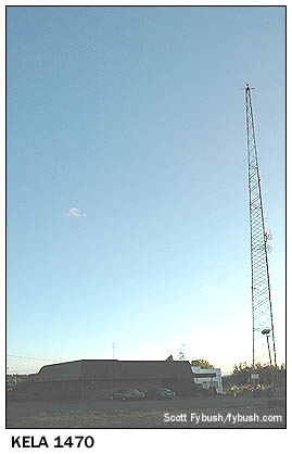 Upstairs, the general manager's office sits right above the air studio, complete with a telescope to better observe all the ships and birds going by. The rest of the second floor is the sales office, plus some storage space over the front of the building. The AM tower sits right out in the parking lot, with a ground system extending into the water, giving this kilowatt on 1240 plenty of punch. It's a great little local station, and we're as hopeful as can be that its owners work things out with the Port of Olympia, which has been trying to relocate the station so it can develop the area with new hotels and restaurants. Another 25 miles heading south on I-5 and we're at our final stop of the day before the sun sets. On the south side of blue-collar Centralia, Washington, we find the short tower of KELA (1470), broadcasting the same Mariners game that was on KGY when we pulled out half an hour earlier. This building is also the studio of KMNT (104.3), which is the big country station for the area. From here, we head on in the dark for another three hours or so before we pull in at our motel in Eugene, Oregon. We'll see that city's stations next week here at Site of the Week - but before that, check in at Tophour.com beginning next Wednesday (Feb. 14) to hear some of the legal IDs we captured in Tacoma, Olympia and Centralia.