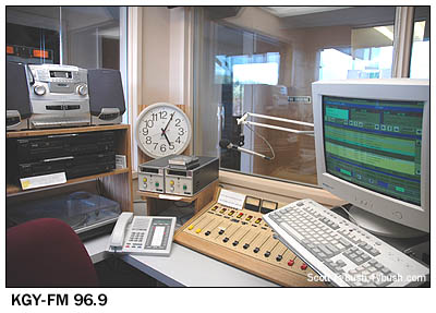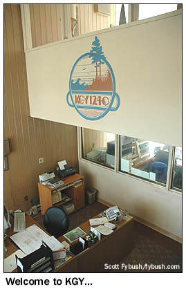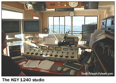 But with many miles yet to travel this first day, and the sky (thankfully) clearing up, we point the car south on I-5 and head for our next destination, Olympia, another 30 miles or so down the road. Our first Olympia stop is a rare triplexed tower, the tall stick shared by KBRD (680 Lacey), KGTK (920 Olympia) and KLDY (1280 Lacey) on Sleater-Kinney Road on the city's east side. KBRD and KLDY are interesting stations, running noncommercially as the legacy of their late owner, Skip Marrow, who programmed standards on "K-Bird" and classical on "K-Lady." A few months after our visit, the foundation established after Marrow's death sold KLDY, which is now doing Spanish religion, but it's using the proceeds to keep K-Bird chugging along with the standards, which seems pretty neat to us. So, for that matter, does our next tour stop: Olympia's venerable KGY (1240), perched right on the water at the Port of Olympia... ![]() Is this a beautiful radio station, or what? We'd wanted to see KGY for a long time, and sales manager Dennis Brown was happy to take a few minutes at the end of his day to show us around the compact two-story building sitting on pilings in the water.