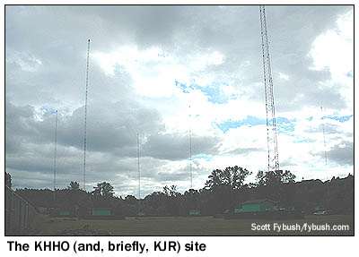 What's a 10-kW day/1-kW night station doing with six towers, when it only uses two towers in its day array and three at night, and one of those is common to both arrays? Therein lies a tale, which is just what we like here at Site of the Week. Back in 1999, you see, this site became home to a second station. Ackerley, which then owned both KHHO and KJR (950 Seattle), lost the lease on KJR's longtime 5 kW tower site at the Port of Seattle, and it soon embarked on an expensive and ambitious project to diplex KJR down here at the Tacoma site, some 30 miles to the south.