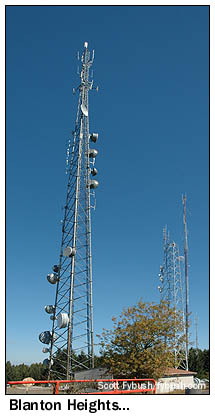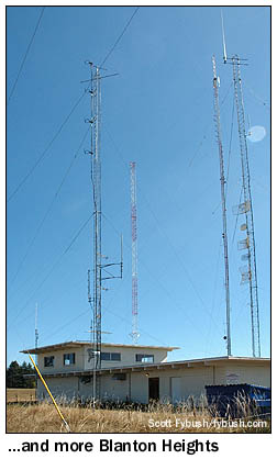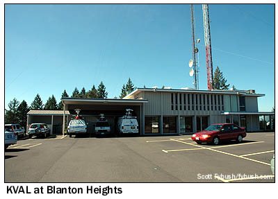 After lunch, we're off to the other TV/FM site in town - Blanton Heights, a couple of miles south of downtown Eugene in the hills that rise sharply from the Willamette River Valley. The star of the show here is Eugene's oldest TV station, KVAL-TV (Channel 13), which not only has its transmitter here, but also its compact studio building. Next to the KVAL building is an 850-foot tower that carries the antennas for KVAL, KVAL-DT (Channel 25), and Oregon Public Broadcasting's KEPB (Channel 28/DT 29).