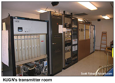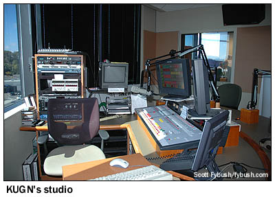 Across Chad Drive is an office park that's home to Fox affiliate KLSR (Channel 34) and My Network TV affiliate KEVU-LP (Channel 23), and a mile or so to the north is the four-tower site of KUGN (590) and KRVM (1280), to which we'll return later in the day. We're already up on the north side of Eugene here, but we can see an even more distant site about two miles to the northwest. Up on Coburg Ridge, those towers are home to KEZI and KEZI-DT (Channel 44), KMTR and KMTR-DT (Channel 17) and KODZ (99.1), as well as a few FM translators and LPTVs. With an hour yet to go before lunch, our whirlwind Eugene tour continues on its way around the city's northwest corner, around the Belt Line Highway and down the Delta Highway to the Goodpasture Island Road exit. This looping road heads through several residential subdivisions and past two nondescript guyed AM towers, one for sports station KSCR (1320), and the other for Spanish KLZS (1450). The KLZS tower is also home, for now, to KKNX (840) - and once KKNX moves over to the 1050 tower in Springfield, KSCR will move to the 1450 site and its own tower will come down. At the southern end of Goodpasture Island Road is the office park that's home to both Clear Channel (recently relocated from a downtown office building that was long home to KPNW) and Cumulus, and we have a brief tour of the Cumulus studios, which are arranged in a "U" shape around a central engineering core. Shown here is a typical studio, for news-talk KUGN (590); down the hall are rocker KZEL (96.1), country "Moose" KUJZ (95.3 Creswell), modern rock KNRQ (97.9), hot AC "Star" KEHK (102.3 Brownsville) and KSCR. By now, it's time for lunch, so we make the short drive south on I-105 to downtown Eugene and a very pleasant outdoor meal in one of Eugene's nice city neighborhoods, a few blocks from the University of Oregon campus. (Actually, most of downtown Eugene is just a few blocks from the university, come to think of it.)