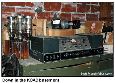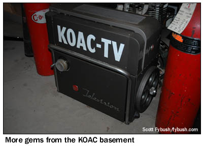 From the outside, the KOAC building today looks pretty much just as it did 65 years ago, right down to the neon call letters above the door that still light up. Inside, the old tube transmitters have given way to a modern solid-state BE AM6A transmitter, which sits next to the phasor in a main transmitter room that's now used largely for storing surplus office equipment and other gear. Out of frame to the right, there's a Sparta backup transmitter that served as the main until 2005, and in the back room there's a beautiful old Collins that still makes power, though it's not often used. Down in the basement, we find a treasure trove of even older KOAC gear, including a console once used for remote broadcasts and an early KOAC-TV camera, which, to judge by its age, was probably a hand-me-down from one of Oregon's commercial TV stations around the time Channel 7 signed on in the late fifties.