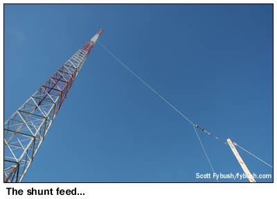 Unlike most towers, even then, these towers were built with grounded bases and shunt-fed, and today they make up, as far as I'm aware, the only shunt-fed AM directional array in the country. At one time, such shunt feeds were a fairly common method of feeding an AM tower. As you can see in the photo above, the feedline from the transmitter building comes into a pit next to the tower, then up to the ATU, up into the air, and out in a sweeping diagonal to a point about three-quarters of the way up the tower. The result is an AM tower you can walk right up to and lean against, as our tour guide, KOAC engineer Pete Hoegg, demonstrates. The FCC no longer allows new shunt-fed installations, since its modeling software has a hard time dealing with them, and today the standard method for putting an AM station on a grounded tower is the folded unipole, which (to oversimplify things, perhaps) essentially folds the feedline of a shunt-fed antenna parallel to the tower. One quirk to the shunt-fed DA here, by the way: it's essentially IBOC-proof, or at least so said the consultants who evaluated all the public radio AM facilities in the country to see how easily they could be converted to HD Radio. For KOAC to make that change would probably mean a whole new antenna system, and there's little likelihood of that happening. After a most enjoyable visit with Pete at the KOAC site, we've still got a lot of driving to do, and not that much daylight, so we regretfully pass up the stations in Albany and Lebanon in favor of another 20 miles or so north on I-5 to the state capital of Salem.