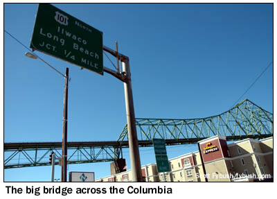 Our next stop this Saturday afternoon is at our host Patrick Martin's house/DX listening post down the coast, north of Seaside, where we see the medium-wave setup that allows him to log some incredible trans-Pacific catches on a regular basis, as well as the lineup of satellite dishes from which he monitors the world. But before we leave Astoria, we look up admiringly at the huge bridge that carries US 101 across the Columbia to Washington State, and the next day we start off heading back north from Seaside to cross the bridge and check out one FM tower on the Washington side, what's now KAST-FM (99.7 Long Beach), up near Ilwaco on the coast.