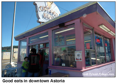 The KAST-FM soft rock format and calls moved up the dial to another reshuffled station. The former KAQX (94.3 Long Beach WA), which had been doing hot AC as "The River," relocated to 99.7 and took on the KAST-FM identity. Confused yet? Did we mention that just a few months later, KCBZ down in Cannon Beach moved from 96.5 to 94.9? And that the KKEE calls now on 1230 came over from 94.3, which had been using them since not long after its debut in 1985? (A look at the station listings here in the mid-80s is instructive; back then it was just KAST and KVAS on AM, the original KAST-FM 92.9 and then-brand-new KMUN on FM, plus KSWB on AM down in Seaside. Everything else you're reading about has come on the air in the last two decades or so.) Any confusion over the tangled history of Seacoast radio was quickly dissipated by a stop for lunch at what would turn out to be our favorite roadside food of the trip: a little stand just down the street from the KKEE tower called "Custard King," with really good hot dogs and excellent custard (and a box out front with flyers offering the place up for sale, a tempting proposition on this gorgeous warm fall afternoon, though it would seem much less tempting a couple of months later when the coast was being pounded by some of the worst storms in recent memory.)