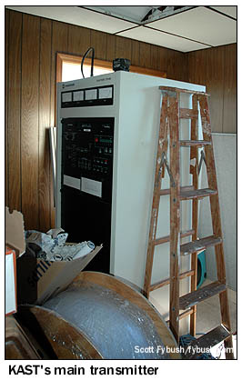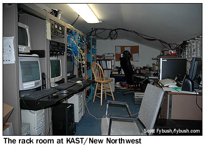 Today, the KAST building is home to two AM stations and three FMs, all sharing studio space up on the second floor, which is also home to a crowded rack room in the attic. In addition to KAST, which does news and talk (including a local gardening show that's going on as we arrive), there's KKEE (1230 Astoria), which has ESPN sports and a local weekday afternoon show; KAST-FM (99.7 Long Beach WA), with soft rock; KCRX-FM (102.3 Seaside), with classic rock; and KVAS (103.9 Ilwaco WA), with "Eagle" country. On this Saturday morning, they're all running on automation, except for the gardening show on KAST, so our group has the building nearly to itself as we explore the studios, then head downstairs to see the sales offices on the first floor, which is also home to an old Sparta that's KAST's backup transmitter and a more recent Gates One, in a little sunroom out back, that's now the main transmitter.