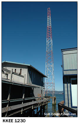 A couple of quick bits of history here before we move along - KAST(AM) traces its history back to 1922 and a station called KFJI. By the 1930s, it had taken the KAST calls and settled down on 1370, which was then a 250-watt local channel. But in the big NARBA frequency shift of 1941, KAST somehow ended up not on 1400, with the rest of the former 1370s, but on 1230, where it spent most of the forties before getting a power boost to 1 kW, DA-N, back on its former frequency of 1370. 1230 then came back on the air in Astoria in the early fifties as KVAS, the calls now on 103.9. The present KKEE 1230 tower, sitting right on the edge of town on piers in the mouth of Columbia River, certainly dates back to the KVAS days (our convention host, Patrick Martin, worked there back then) - could this have been the old KAST 1230 tower before that? It looks old enough, anyway. The FM signals in this cluster underwent a big shuffle just a few months before our arrival. In January 2006, the original KAST-FM (92.9 Astoria), a huge class C signal, went silent as the allocation was moved to the Portland suburb of Gladstone, 60 miles or so to the east, downgraded to C3 on 93.1, and sold to Salem to begin a new life as talk KTRO-FM. (We'll catch up with it again in next week's installment.)