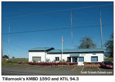 Tillamook's radio stations sit a mile or so west of downtown, where Netarts Road crosses the Tillamook River. KMBD (1590) is all satellite talk, while KTIL-FM plays standards. It, too, was part of the big frequency shuffle of early 2006, moving from 94.1 to 94.3 to make room for KPDQ-FM in Portland to go from 93.7 to 93.9, which made room for the former KAST-FM on 92.9 in Astoria to go to the Portland market as 93.1 in Gladstone...but we'll get there soon enough. Actually, we'll get there in just a couple of hours, as we turn inland on Route 6 for a zippy drive up to US 26 and east to Portland and a jam-packed afternoon of tower hunting. Join us here again in just one week as we begin recounting our adventures in Oregon's largest city, and join us over at Tophour.com starting Wednesday, March 7 to hear a bunch of legal IDs from all these stations.