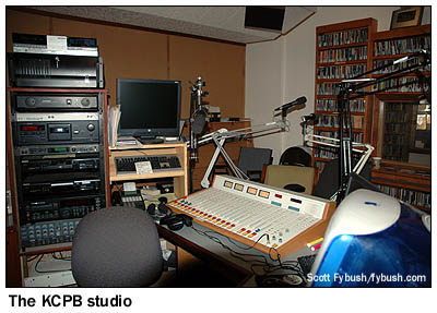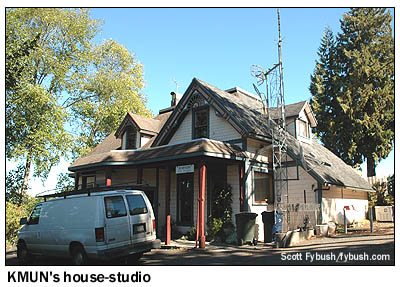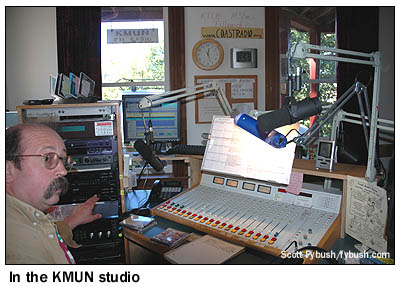 Our little group walked off lunch with a brisk uphill stroll through downtown Astoria to the little house that serves as the studios for "Coast Community Radio," which operates two stations. KMUN (91.9 Astoria, with simulcast KTCB 89.5 Tillamook and a bunch of translators) is old-fashioned community radio, run largely by volunteers with an eclectic program schedule that includes everything from "Morning Edition" to "The Scandinavian Hour" to the folk show that's on when we wander in. (Host Kevin Palo is a carpenter, and a very skilled one at that, when he's not spinning folk tunes. Plus, he had bumper stickers from both KFAT and KPIG on his van out front, and it doesn't get much cooler than that.)