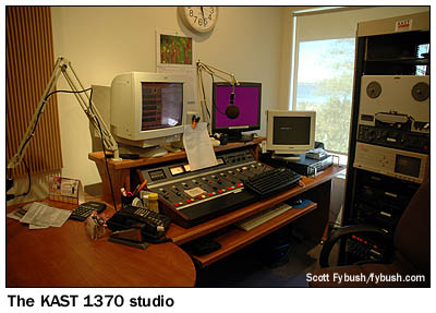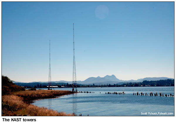 These conventions (this year's takes place in Salt Lake City in late August, just a week before the National Radio Club and the Worldwide TV-FM DX Association hold a joint convention 300 miles away in Boise - hmm...another Big Trip in the works?) frequently include tours of radio stations, and while we've missed out on a Friday-afternoon visit to Seaside's local stations, KSWB (840) and KCBZ (94.9 Cannon Beach), we're ready to go for the Saturday morning event, a drive 20 miles north along the coast to Astoria and the cluster of stations owned by New Northwest Broadcasting. The studios are in the building along Youngs Bay that's also the transmitter site for the city's oldest station, KAST (1370) - and, yes, that shot of the towers in the water at the top of the page will surely show up in a future Tower Site Calendar.