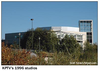 KPTV is long gone from there, after an action-packed history; after an affiliation swap with KGW made KPTV an ABC affiliate in 1959, the debut of KATU (Channel 2) in 1962 soon turned KPTV into an independent. It became a charter Fox affiliate in the mid-80s, but after disputes about carrying low-rated weekend Fox offerings (this was decidedly pre-Simpsons and pre-NFL!), KPTV went back to independent status in 1988. In 1995, it joined UPN, and in 1996, it left SW 20th Place after 43 years, building a fancy new studio at 211 SE Carruthers, on the east bank of the Willamette River south of downtown. That's the building you see at right - but KPTV's not there, either, and neither is the huge neon "12" sign that was in the glass tower along the river. (You can see that on the "Yesterday's KPTV" site, too.) In 2000, Chris-Craft (which had owned KPTV since 1960) was sold to Fox, but KPTV didn't come along for the ride, getting traded to Meredith in exchange for WOFL in Orlando. Meredith already owned Fox affiliate KPDX (Channel 49) in the market, and in 2002 it moved Fox back to KPTV, consolidated the two stations' rival news operations, and moved KPTV out to the KPDX studios in Beaverton, which we saw last week. (KPDX would eventually migrate from UPN to My Network TV, and today brands itself as "PDX49," wisely eschewing much on-air mention of that struggling mini-network.) So now you know why we were so interested in seeing the SW 20th Place building, which still (to us, anyway) carries some of that exciting whiff of anything-goes early local TV, however much it's been renovated in the interim.