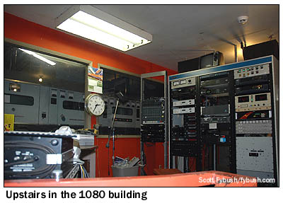 The ground floor is used for storage, and a curved stairway leads up to the good stuff on the second floor, where a wall (painted bright orange) separates the equipment racks from the transmitters - a Continental 317 and, beyond it, a Harris DX50 tucked in the corner. There's a second-floor doorway around the back of the building that allows for the transmitters and phasor and other big equipment to be hoisted in, so there's no tricky lifting up that narrow stairway. (And, yes, this is a floodplain...) 1080's now all-sports KFXX, a format and a set of calls that have migrated around the dial from 1520 to 910 to 1080, where they replaced talk KOTK; the KWJJ calls live on, of course, at 99.5 on the FM dial.