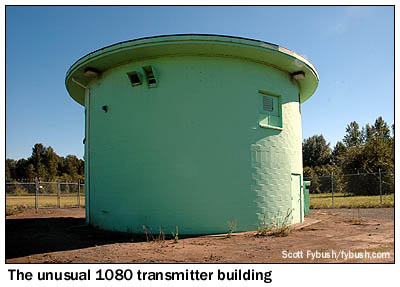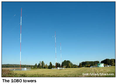 From the 910 site, it's only half a mile or so east to the three towers of Portland's AM 1080, known for most of its life as KWJJ. As we mentioned last week, KWJJ (then on 1040) went on the air in 1936 from Oaks Park, then moved to Smith Lake in 1948. In 1966, KWJJ abandoned the Smith Lake site and moved to this site off Marine Drive, with its most unusual cylindrical transmitter building. A decade or so later, KWJJ replaced a five-tower array at this location with its current 208-foot top-loaded towers