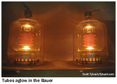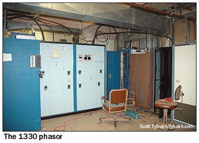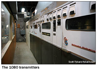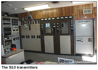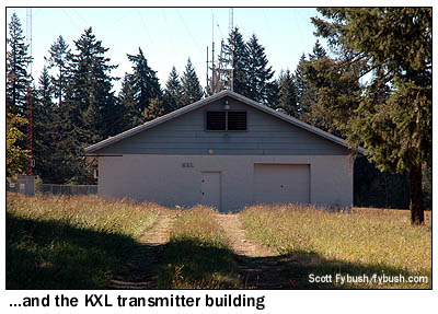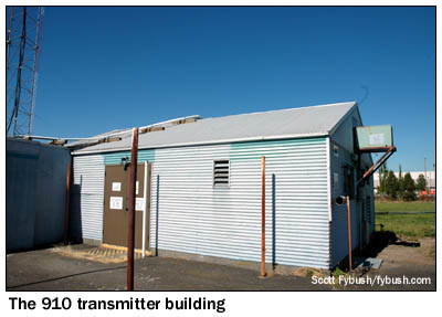 KISN (910 Vancouver WA) was the big top 40 outlet in the market when it moved to its present four-tower site, about two miles east of the Portland airport, in 1966, relocating from an earlier site near Smith Lake, also along the Columbia River to the west. KISN lost its license in 1976 as part of the FCC's refusal to renew any of the licenses held by its owner, Don Burden, who was accused of using his stations' newscasts to favor particular political candidates. It returned under new ownership and with new, similar calls, KKSN - and after several other formats and calls (sports KFXX, talk "Max" KOTK), 910 is once again KKSN and playing oldies when we arrived there on that warm September afternoon. (The "Kisn" oldies format had recently returned to the AM dial after a long stretch on 97.1, which had recently flipped to adult hits as "Charlie FM" KYCH.) Stepping inside the front door, we're greeted by some nice vintage transmitters: a Rockwell Collins Power Rock that's the main, and a 5 kW Bauer that's still a working auxiliary. (Just to prove the point, Kent fires it up for us, and those tubes sure do look nice in there, don't they?) Alas, the oldies didn't last much longer at 910: in January 2007, Entercom sold the station to Salem, which flipped it to talk as KTRO, simulcasting its FM talker, KTRO-FM 93.1 Gladstone.