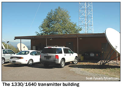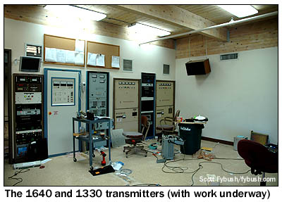 There's no more KUPL-FM up here now, either; in 1997, it moved from 98.5 back to 98.7, eliminating an IF-spacing issue with the audio carrier of KOIN-TV (Channel 6), and relocated to the Sylvan site. Today, Mount Scott's various towers are home to lots of two-way, a few LPTVs, and two AMs: 1330 is now KKPZ, "Praise 1330," a Crawford religious outlet, sharing one tower of its three-tower array with the market's Radio Disney signal, KDZR (1640 Lake Oswego). That X-bander is the descendant of the old KLIQ (1290), which started out over at Oaks Park, then spent the rest of its life sharing the 1520 (ex-KYXI, ex-KGON, ex-KFXX, now KGDD) site not far from KEX. 1290 finished its existence as KKSL, a sister station to KKPZ, before signing off in favor of the X-band outlet in 2005. (Disney was actually LMA'ing 1290 back to Crawford at the end.) When we visit the 1330/1640 site, engineer John White is hard at work on KKPZ's Nautel (at center in the photo above), so 1330's running on one of its older Continentals, while 1640 chugs along on the Nautel at left. John takes a few minutes to give us a tour of the place, including the view out the window to Mount Hood in the distance and to the big skirted antenna around the 437' center tower (those are 20-foot arms spacing the folded unipole out from the tower). 1640 is diplexed into the tower in the foreground in the photo above; it's a typical 10 kW day/1 kW night X-bander, though it once held a CP to go 10 kW at night from all three towers.
