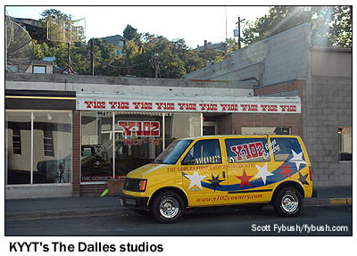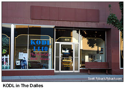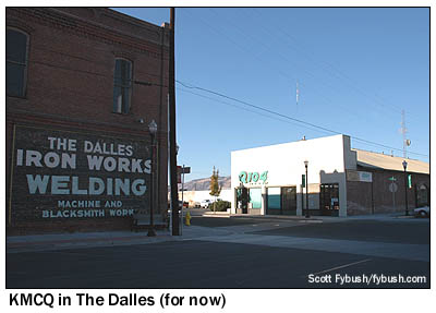 From Hood River, we cross the Columbia to Washington State, driving some 30 miles along the river's north shore and then crossing the river once more to enter The Dalles, Oregon, the commercial hub of the Gorge region. The Dalles has been in the news in the radio engineering community lately because of the impending move of its big class C FM signal, KMCQ (104.5). It will soon leave this town behind and move to a new city of license of Covington, Washington, which just happens to be a suburb of Seattle, 100 miles and several mountain ranges to the northwest - but for now, it's still local to the The Dalles, with studios on E. Second Street downtown.