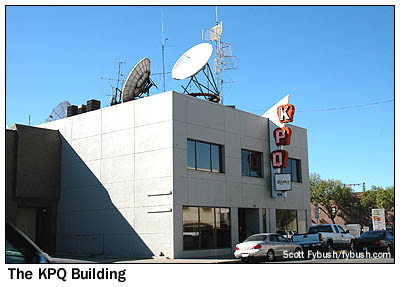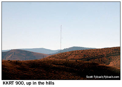 Wenatchee is home to one of Washington's oldest radio stations, and to the last new 3-letter callsign we'll add to our log on this trip. KPQ (560) signed on in Seattle in 1928, then moved to Wenatchee in 1929 under the ownership of the Wenatchee World, a fine local paper with one of the greatest (or at least longest) slogans we've ever encountered, to wit: "Published in the Apple Capital of the World and the Buckle of the Power Belt of the Great Northwest." They take their apples very seriously in these parts - those are apples making up the letters in the "K P Q" sign on the studio building at 32 N. Mission Street, a block west of Wenatchee Avenue, and the "O" in the nameplate of the World, right next door, is also an apple. (And just as this edition of Tower Site of the Week hits the web, the annual Apple Blossom Festival is starting in Wenatchee, too.) KPQ has expanded over the years: this building is also home to KPQ-FM (102.1), a big-signalled classic hits station that goes by "The Quake," as well as to another cluster of stations under different ownership: Morris Communications' "Columbia River Media Group" that includes KKRT/KWIQ, country KKRV (104.7 Wenatchee), country KWIQ-FM (100.3 Moses Lake) and Spanish-language KWLN (103.3 Wilson Lake). And no, I have no idea how those stations all ended up sharing a building with KPQ and KPQ-FM. (Nor, for that matter, can I adequately explain how it came to pass that Wenatchee never managed to sustain a full-power TV station; the place is isolated enough from other TV markets, certainly. Today, Wenatchee gets most of the Seattle stations and a few Spokane stations on cable, as well as the big Spokane stations via translator, but none of those stations spend much time covering the Apple Capital of the World, etc. Howard Fine in Los Angeles reminds me that there was a full-power station in Wenatchee, KCWT-TV 27, that went on in 1984 as an indie, joined up with Fox in 1986, went indie again in 1990, then spent a few years as a TBN outlet before going off the air when its transmitter failed in 1993. TV now in Wenatchee is represented by a local LPTV network, based at KWCC-LP 47, that's carried on cable and offers some local programming, including the daily "Toast and Coffee Show.")