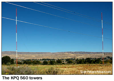 From the KPQ studios, we head back north on Wenatchee Avenue to US 2, listening to AM 560 as we go. They're airing their 2 PM talk show, cleverly named "The Two O'Clock Show," as we make the drive to the transmitter site once known as "KPQ Ranch", tucked in between Wenatchee Avenue and the Columbia River next to the Wenatchee Confluence State Park on the north side of town. It takes a bit of a hike down a walking trail next to a big power plant to get a good view of the two towers, and we never did get a good look at the 1937-vintage transmitter building. The station's history claims the building floated on 15 feet of water during the huge Columbia River floods of 1948, and that's a site we'd love to have seen! (KPQ now uses 5 kW day and night, going directional only at night.)