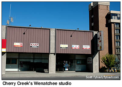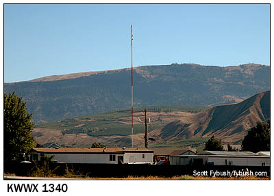 The Cherry Creek Radio group has a large presence in Wenatchee and nearby Quincy, both in English and in Spanish. On the English side, the studio at 231 N. Wenatchee Ave. is home to hot AC "KW-3" KWWW (96.7 Quincy), country KYSN (97.7 East Wenatchee), AC "Apple" KAAP (99.5 Rock Island) and classic rock KZPH (106.7 Cashmere); in Spanish, it's "La Super Zeta," KWWX (1340 Wenatchee) - and yes, we noticed that there's no "Z" in "KWWX." The KWWX tower is located on the south side of East Wenatchee, across the Columbia River, and it's home, ironically enough, to an FM booster owned by a direct competitor - Bustos Media's "Zorro" KZML (95.9 Quincy) runs 1900-watt booster KZML-1 from that two-bay FM antenna on this tower.