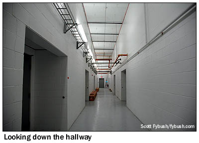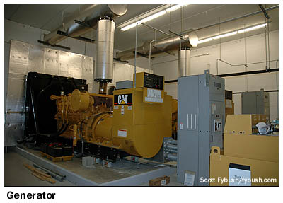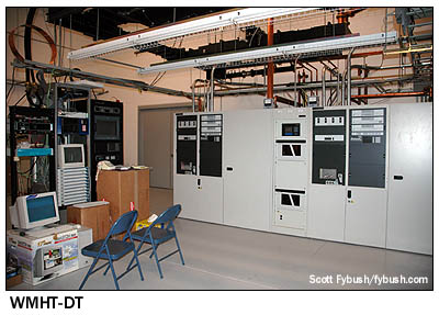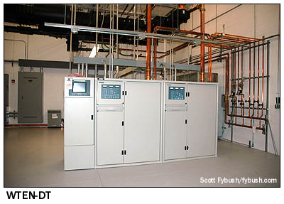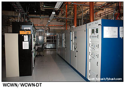 These rooms are very large, providing lots of expansion space for whatever comes next - and in the meantime, as you can see from the photos below, there's lots of empty space around most of these transmitters. (In our travels so far, we've only seen two other DTV sites that were so comprehensively designed to serve most or all of a market's DTV needs - the new DTV site in Syracuse, which ended up with only a few signals on it so far, and the WBZ digital facility in Boston, which was designed for four stations with room for several more. Any nominations for others we should see?)