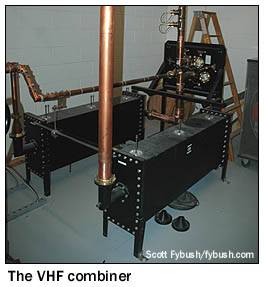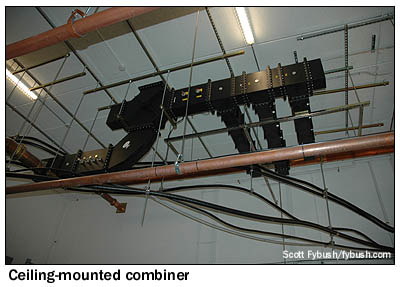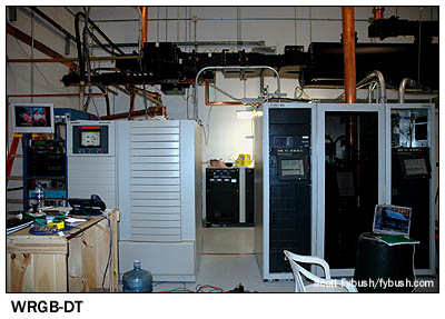 A June 2006 visit to the new building and the new 500' tower brought us inside most of the transmitter rooms, starting at WRGB, where engineers were working on one of the two transmitters. Down the hall, there's a huge generator room that can keep all these signals on the air no matter what's going on outside. Across the hall, the VHF combiner for 7 and 12 is floor-mounted in the combiner room, while the UHF combiner for 26, 34 and 39 hangs from the ceiling to save space. (This room also houses some government two-way gear.)