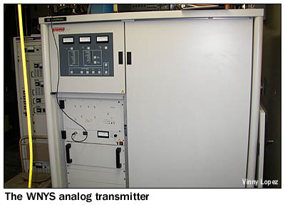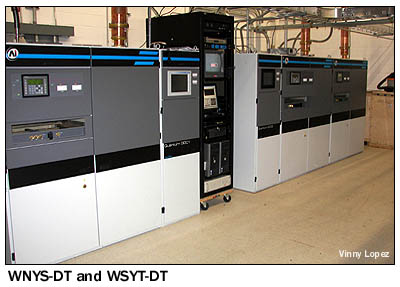 The WSYT and WNYS transmitters are located at a site in Otisco, 15 miles or so south and west of the studios, where there's a 1019' tower that slams a signal all over central New York and quite respectably covers the 65 miles or so over here to Rochester as well. The original part of the building houses a Pye transmitter (a rare sight in the US) for WSYT, and a newer Harris for WNYS' analog operations. Look closely behind the WNYS transmitter to see the little low-power Harris from which WSYT-DT (Channel 19) first fired up a few years back.