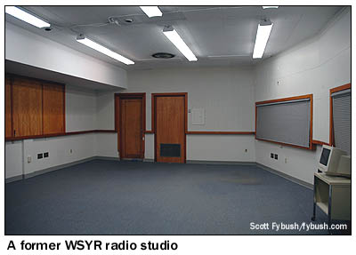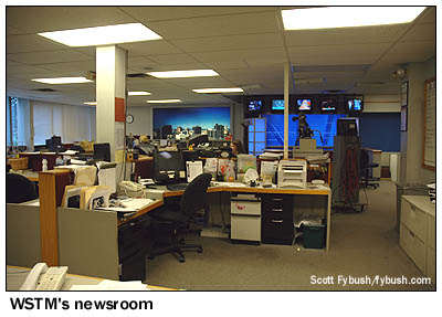 WSYR radio hasn't been associated with Syracuse's Channel 3 TV facility since 1980, when the Newhouse family sold its radio and TV stations off to separate owners. But the radio space in the old WSYR building at 1030 James Street is still clearly identifiable as a radio studio more than a quarter of a century later - and when we arrive there, it's sitting vacant. Here's the explanation: Channel 3, now WSTM (for Times-Mirror, which bought the station from the Newhouse family in 1980), had been operating PAX affiliate WSPX (Channel 56) out of this space for a few years - but the PAX stations, now renamed "i Network," pulled out of most of those LMA arrangements, and so there's a big empty space on the main floor where the radio studios used to be. Down the hall, there's plenty of non-empty space in the Channel 3 building - the newsroom is at the far end of the hallway, spreading out into a warren of offices and edit bays up and down the stairs at the back of the building.