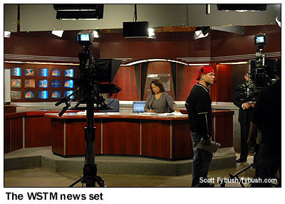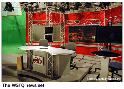 Behind the former radio space, the old TV control rooms from the late fifties have been replaced with modern equipment for WSTM and its current sister station, WSTQ-LP (Channel 14), known on-air by its cable channel - and on this September afternoon, it's in the process of segueing from "UPN6" to "CW6," as that new network prepares to launch in just a few days. Though the windows are mostly blocked now, the control rooms still overlook the two big studios downstairs. One of them is home to the news sets for WSTM and for the 10 PM newscast on WSTQ; the other is used for interview shows and other special productions. There's also a huge garage and scene shop, a relic of the days when there would have been all sorts of live performances taking place down here.