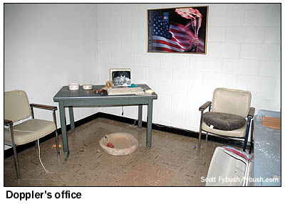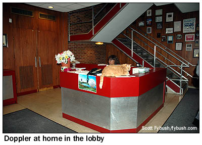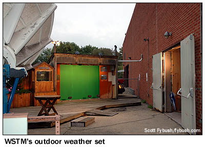 Out the back door, one of the big NBC satellite downlink dishes sits next to the set for WSTM's outdoor weathercasts. That little hutch next to the green screen is a perch for "Doppler, the Weather Cat," who has his very own office down the hall from the studios, in what was probably a dressing room back in the day. (The current Doppler is the third incarnation, incidentally - Doppler #1 met an untimely demise, we're told, and his successor didn't have good people skills.)