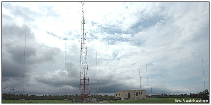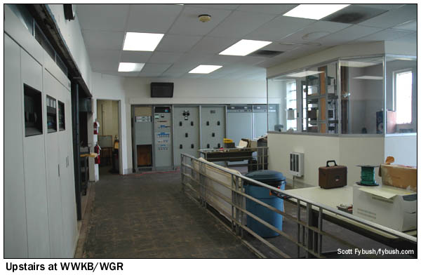 ![]() August 3, 2007 WGR 550 and WWKB 1520, Hamburg, NYOver the last seven years of Tower Site of the Week, we've taken you (virtually speaking) all over the world in search of interesting broadcast facilities - everywhere from Bonaire to Paris to Tijuana, with "guest episodes" from Nome and American Samoa, too. Amidst the thrills of seeing Walla Walla or Dubuque, though, we tend to forget about all the nifty broadcast facilities closer to our base in western New York. So when our colleague Mike Fitzpatrick called up last summer and mentioned he was interested in spending a few days visiting Syracuse, Buffalo and Rochester, it was all the excuse we needed to finally get around to showing you some of the sites in our neighborhood. ![]() After a full day of visits to the towers and studios of Syracuse, we next turned our attention to our neighboring city to the west, Buffalo. For years and years and years, we've seen the lights of the city's biggest directional array as we've headed southwest out of town on the Thruway, and many times we've made the drive down Big Tree Road in the town of Hamburg to get a closer look at the array that's shared by WWKB (1520) and WGR (550) - but we'd never been inside the big building here until Mike came to visit. Before we go inside, we need to do a bit of explaining about the tower configuration here, because it's confusing at first glimpse. The easiest part of the array is the DA-1 for 1520 - it's those three guyed towers seen at the left side of the composite picture above, behind the self-supporter. Day and night, they put a deep null to the southwest, protecting KOMA (now KOKC) in Oklahoma City. (The daytime null also allowed for a bunch of stations to set up shop on 1520 in Ohio, as close in as Kent and Canton, just a couple of hundred miles away.) WGR is more complicated: it began as 5 kW days, 1 kW nights, DA-N, using the 328-foot guyed tower seen just to the right of the transmitter building by day and adding the leftmost of the WKBW towers to the array at night. In 1947, WGR raised its night power to 5 kW, adding the 355-foot self-supporting tower at the northeast corner of the property and a 328-foot guyed towers seen at the right (northwest) side of the picture to create a four-tower rectangular array for the night signal. Over the years, WGR has moved its non-directional daytime signal from tower to tower; it moved to the self-supporting tower in 1947, and then when the self-supporter acquired a ring of cellular antennas as leasing tenants a couple of years ago, WGR moved its daytime signal to the northeast corner of the property - the tower at the rightmost corner of this picture.