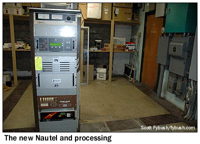 In the meantime, the site that had been so remote in 1947 had become part of inner-ring suburbia. The opening of the Outer Loop and Genesee Expressways (I-390/I-590) in 1980 not only helped fuel that sprawl, but also brought tens of thousands of drivers a day past the 950 transmitter site, which today sits just south and east of the ramp that carries northbound 390 traffic to northbound 590. Office parks replaced most of the farmland that surrounded the site, and a residential development is now being planned for the piece of land just east of the 950 site (which was itself an early site for 1280, but we'll get there in a later Site of the Week installment.) WROC today is a progressive talk station, with all its programming fed by satellite to studios in the High Falls district downtown. Its signal reaches only part of the market clearly, especially at night, and it's a credit to Entercom that it's spent as well as it has to keep the site on the air and up to date. One enters the building now through the door at the south end of the building, not the old main entrance, and the first thing in sight is the 950 transmitter room, where a vintage Gates BC-1G keeps company with a Gates MW-1 that's fairly vintage itself. As the MW-1 began aging (becoming effectively a "MW-1/2," as the joke went), Entercom sprung for a new solid-state box in 2005. The Nautel J1000 shown below takes up only a few inches of rack space, but has received rave reviews from the engineering crew at 950.