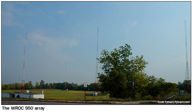 ![]() September 21, 2007 Rochester's AM 950 (WARC/WBBF/WEZO/WROC)Welcome back to another exciting season of Tower Site of the Week - and thanks for your patience during our busy summer travel schedule! We have one more trip still upcoming (North Carolina and Virginia, around the NAB Radio Show at the end of September), but we're excited about all the great tours we'll be sharing with you in the months to come. We'll take you to some big AM signals (WBBM, WSCR, KSL), some unusual arrays (how about an AM directional array with I-90 running right through the middle?), some prominent FM/TV mountaintops (Boise's Deer Point, Las Vegas' Mount Arden), not to mention the fields of Iowa, the FMs of Utica, and many more. This week, though, we continue our look at some sites that are much closer to home - indeed, at one of the four AM sites that formed a cluster of towers near your editor's boyhood home (and his present residence, for that matter), helping to build his early interest in radio engineering. ![]() We've touched briefly on the AM 950 array in an earlier edition of Tower Site of the Week that provided a broad overview of this very special cluster of AM sites. But when we wrote that overview back in 2000, we'd (inexplicably) never been inside the 950 transmitter building - and as it turned out, we were missing most of what made this site special as a result. The history first, of course: In the years just after World War II, the Rochester radio dial exploded, with three new stations joining the city's three existing stations - with two of those getting power increases and the third getting a new site. The second of the three new stations to make it on the air, as steel and copper and other building materials once again became available, was WARC (950), which claimed the ABC affiliation that had never found a home in the market (Rochester's established stations, WHAM and WHEC, had long ties to NBC-Red and CBS, respectively). For a downtown studio base, WARC found space in the Sagamore Hotel at 111 East Avenue, which had been the pre-war home of WHAM. And for a transmitter site, WARC looked south of Rochester, as more or less mandated by the need to protect established signals on 950 in Utica to the east, Detroit to the west and Philadelphia to the southeast. WARC ended up with 1000 watts both day and night, with the day signal emanating from two towers arranged roughly east-west and the night signal using a three-tower in-line array with the north tower common to the day array. (In the photo above, looking east, the night array is in the foreground, with the daytime dogleg tower at rear left.) Those 200-foot towers (they'd surely have been built to only 199 feet if they'd come along later, though the proximity of this site to the Rochester airport might still have forced lighting and painting) were positioned at what was then the extreme southern fringe of the Rochester market, along the Erie Canal about six miles south of downtown Rochester near the end of South Clinton Avenue.