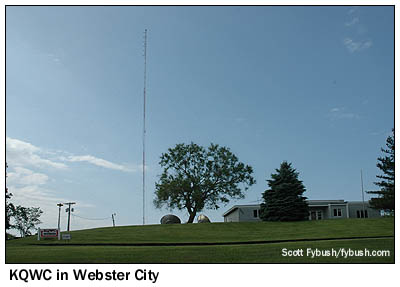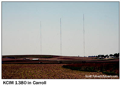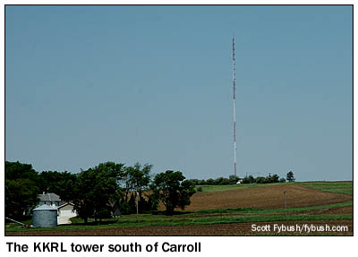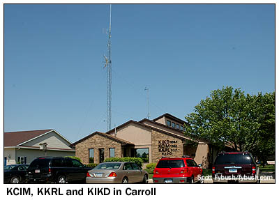 Back in 2001, our route out of Fort Dodge took us straight west on Iowa 7 to Storm Lake and eventually into Sioux City. This time around, we headed southwest on US 20 to Rockwell City, south on Iowa 4 to Lake City, west on Iowa 175 and eventually south again on US 71 into Carroll, a busy little town that's just far enough from Omaha, Des Moines and even Fort Dodge to maintain what looked like a fairly vibrant downtown area, complete with a low-power FM (Catholic KYMJ-LP 103.1) occupying a storefront with a small tower out back. On the way down US 71, we saw in the distance a tower shared by Carroll Broadcasting's country KIKD (106.7 Lake City) and Iowa Public Radio's KWOI (90.7 Carroll); on the east side of Carroll, on a frontage road off US 30, we find the well-maintained studios for KIKD and sister stations KKRL (93.7 Carroll) and KCIM (1380 Carroll), doing hot AC and soft AC/full-service, respectively.