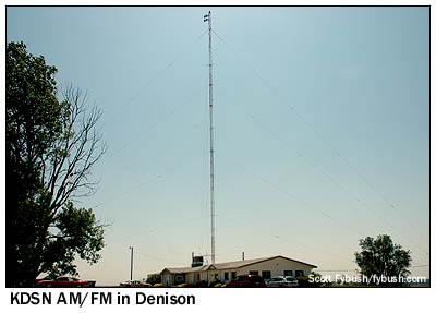 The towers for KCIM and KKRL are southeast of town off US 71; KCIM uses three towers for its 1000-watt, DA-2 operation, while KKRL's 100 kW C1 operation sits on a short tower just a third of a mile to the north. KCIM is part of the far-flung Chicago Cubs radio network, and for the remaining two hours or so between here and Omaha, we have little trouble holding on to its signal as we listen to a Cubs/White Sox interleague game. Our final Iowa stop for now is about half an hour west of Carroll, where KDSN (1530 Denison) and KDSN-FM (107.1 Denison) sit up on a gravel road on a ridge north of that small town. The two stations appear to simulcast part of the day, breaking away for a long farm report on the AM signal in the midday slot - and we bet the AM's 13 watts still cover the town after dark, when it powers down from its 500-watt daytime signal.